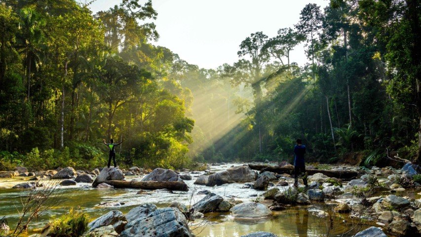 Morning brings the quiet strength of Borneo: an orangutan steps from the trees with the calm of an elder; a longhouse door opens and you’re welcomed not as a stranger, but as a guest. The coast smells of salt and leaves; wind lifts the mangroves like a curtain.